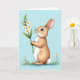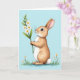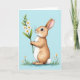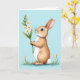 Designed with a gentle long-eared bunny standing in the center, this card shows warm brown fur with creamy white on the chest and a soft blush on the cheeks 🐰. The bunny holds a thin green stem topped with small white flowers, and its dark eyes tilt upward with a tender, daydreamy look, like it’s thinking of someone close. Behind it, a wide wash of pastel blue suggests open spring sky, keeping the focus on the quiet moment. Along the bottom, a narrow strip of green grass grounds the scene, with a few tiny white blossoms scattered like little reminders of the bouquet 🌷. The main greeting text sits near the top in a light, easy-to-read color that stands out against the blue without shouting. Smaller text can be placed near the lower edge in a matching tone, leaving plenty of open space around the character. A round, fluffy tail peeks out at the side, softly shaded against the blue background.