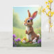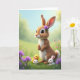 This card shows a tall, long-eared creature standing on its hind legs with caramel-toned fur, a white chest and tail, and a small purple flower resting near one ear 🌷. Two smaller white companions lean close at its feet, their wide eyes turned up toward the taller figure in a way that suggests gentle friendship and care 🐰. A tiny yellow fledgling nestles beside them, adding a soft, cozy note to the little group. The setting is a sunlit meadow with a pale green field fading into a calm, sky-blue background, softly blurred to keep the focus on the characters. Pink and purple wildflowers dot the grass around their paws, and faint rosy cheek shading and fine whisker details give the faces a tender, affectionate look. A short Easter greeting sits near the top in rounded lettering, colored in a light pastel tone that stands out against the airy background. Smaller text is placed beneath the main line in a darker shade for contrast, leaving plenty of open space around the scene. Near the bottom edge, scattered blossoms and blades of grass frame the group, with the purple flower on the taller creature echoing the meadow colors.