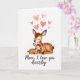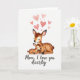 Designed with a soft, watercolor-like look, this card shows two gentle forest animals cuddled close, a larger doe-like figure leaning into a smaller fawn-like one with their eyes closed in calm affection ❤️. Their coats blend warm russet and caramel shades, and the little one has small white spots that add a sweet, youthful touch. The pair’s relaxed poses and the way their faces rest together suggest a trusting bond, like a quiet moment shared between close family or dear friends. Above them, several small rosy-pink hearts float upward into a wide white background, giving the scene a light, airy feel 🌼. The background stays mostly blank, which keeps attention on the animals and their tender closeness. Near the bottom, a short message appears centered beneath the figures in a flowing dark gray line of text. Subtle shading along their ears and cheeks adds depth, and the pink hearts look slightly translucent against the white space. Share your Mother’s Day sentiments with a gentle design where pink hearts rise above the nestled pair on a bright white field.