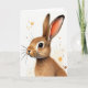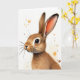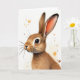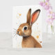 This card features a close-up portrait of a gentle long-eared bunny 🐇, shown with its head slightly turned as if glancing toward someone nearby with a tender, curious look. Its fur is painted in soft tawny and rich brown tones, with smooth shading that makes the cheeks and muzzle feel cozy and inviting. One large dark eye, lightly rimmed with a rosy tint, adds a calm, affectionate focus, like a quiet moment shared between friends. The background stays bright white, keeping the bunny front and center while warm, watercolor-like splatters in ochre, sienna, and burnt orange drift around it like scattered petals 🌷. The inner ear glows in a striking orange-red, creating a warm contrast that draws your gaze upward and adds a gentle spark to the scene. A simple Easter greeting sits near the top in a soft brown color, with smaller text placed below in a lighter tan to keep the layout airy. Fine whiskers fan out from the muzzle, and the warm paint flecks cluster more heavily along the sides of the white background.