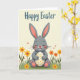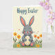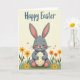 This card shows a gray-furred bunny centered on a creamy beige background, with tall ears lined in soft pink and a calm expression that feels like a quiet hug 🐰. Its eyes are closed with a small smile, and fine whiskers and a rosy cheek blush add a gentle, friendly warmth. The bunny holds an egg close to its chest, as if sharing something cherished, and the egg is decorated with tiny yellow flowers and green leaves on a creamy-white base. Along the bottom edge, a spring strip of green grass supports simple blossoms in yellow and warm orange with red centers, forming a bright garden border 🌷. Small red hearts drift around the bunny, like little notes of affection floating between friends. Near the top, a seasonal greeting appears in a flowing blue-green style, centered and spaced above the character. The light looks soft and diffused, giving the bunny and egg a smooth, rounded look while the grass and flowers sit in a neat band across the lower border.