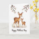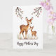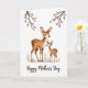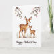 This design shows a gentle spring scene on a bright white background, centered on an adult forest deer with a warm fawn coat and soft white spots standing close to a smaller young deer. The little one tilts its head up with wide, trusting eyes, and the adult’s calm stance and lowered gaze suggest a protective closeness ❤️. Both animals have softly shaded fur with faint blush accents on their cheeks, giving them a tender, almost human warmth without changing the natural look. They stand on a small patch of earthy ground with light green sprigs and wispy leaves, like a quiet woodland clearing. In the upper corners, thin bare branches stretch inward and hold tiny pink-and-white buds, adding a gentle spring touch 🌼. Near the bottom, the words “Happy Mother’s Day” appear centered in flowing cursive-style lettering in a dark gray tone. The branches arch in from the top left and top right, framing the pair beneath the open white space.
