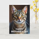 Designed with a close, head-on portrait of a regal tabby cat, this card pulls you in with a steady, affectionate gaze that feels like a quiet moment shared ❤️. The cat’s large eyes glow in amber-gold tones with sharp vertical pupils, giving it an attentive, almost knowing look. Warm browns, deep ochres, and creamy stripes flow across the fur in fine detail, suggesting soft texture and gentle warmth. A small pink nose sits at the center, with delicate white whiskers fanning outward like a subtle flourish. Soft, diffused lighting smooths the contours of the face while the background fades into a blur, keeping the focus intimate and calm. Along the bottom edge, the message “HAPPY MOTHER’S DAY” appears in bold white sans-serif lettering, standing out clearly against the darker tones. A tiny 🌼 accent can be imagined in the cozy color palette, where the warm hues and tender expression feel welcoming. The words sit prominently at the bottom while the cat’s glowing eyes remain centered above, framed by striped fur and bright whiskers.