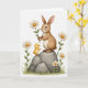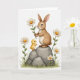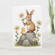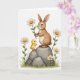Designed with a gentle, watercolor-style look, the illustration shows a soft brown, long-eared animal perched on a faceted gray rock, leaning forward with a calm, affectionate gaze. In its small paws, it holds a white daisy-like flower with a warm yellow center, as if offering it with quiet care 🌷. Below on a lower ledge, a fluffy yellow bird stands with wide eyes and one tiny wing lifted, meeting the animal’s look like a shy thank-you 🐰. Around them, a few more white blooms rise on green stems, with scattered blades of grass that keep the setting simple and outdoorsy. The light is diffused and airy, softening the edges of the rocks and giving the scene a tender, friendly closeness. Any greeting text sits near the top in a light gray tone, leaving the characters and flower as the main focus. The gray rock planes show subtle shading lines, and the nearest daisy petals curve outward in crisp white against muted greens.