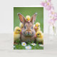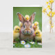 At the center of the card is a close-up of a calm brown rabbit 🐰, with large dark eyes that seem to linger gently on its tiny companions. Five fluffy yellow chicks gather around it, their small pink beaks tucked close as if sharing a quiet secret of friendship. One chick perches on the rabbit’s head while the others nestle along its cheeks and fur, creating a cozy little cluster. The background is a soft blur of green grass that keeps the focus on the tender faces and textures in the foreground. White daisies with sunny yellow centers peek up from the grass, adding a springtime touch 🌷. Soft light highlights the chicks’ down and the rabbit’s fine whiskers, giving the scene a calm, affectionate glow. A simple Easter greeting sits near the top in light-colored lettering, with a smaller line of text placed near the bottom in a gentle pastel shade.