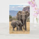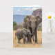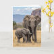 This card shows an adult grey, wrinkled giant with wide fanning ears standing close to its smaller youngster, their bodies angled together in a protective, affectionate way ❤️. The parent faces forward with a steady gaze while the young one tilts slightly, lifting its short trunk in a curious curl as if reaching toward the adult. Both figures sit centered on the front, with fine skin textures and soft shading that make their closeness feel tender rather than distant. Around their legs, sunlit golden grasses fill the lower area, giving the scene a warm, grounded setting. A short line of text sits near the top in a gentle dark tone, leaving the animals unobstructed and easy to see. A second, smaller line appears near the bottom in a lighter matching color, tucked just above the grass line, with a small 🌼 accent nearby. In the background, scattered trees stretch across the open plain, and a flat-topped mountain range rises beneath a pale blue sky. Puffy white clouds drift above the mountains, with soft light falling across the scene and faint shadows at their feet.