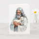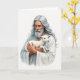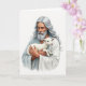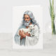 This design shows an older, wise-looking man holding a small white lamb close to his chest, centered on a plain white background that keeps the moment intimate and focused 🐇. Long gray hair and a full beard frame his face, and his lowered gaze suggests a tender, protective bond like a trusted friend watching over someone small. He wears flowing robes in calm blue and soft white, with gentle folds that echo the careful way his hands support the lamb. The lamb rests quietly against him, its wool textured and bright, with a pink nose and pale inner ears adding a soft touch of warmth 🌷. Light falls in a smooth, diffused glow with almost no shadow, giving both figures a calm, close-up stillness. There is no border or scenery, just open space that makes their closeness feel even more personal. Small text sits near the top in a light blue color, leaving the man and lamb as the main focus beneath it. The robe’s blue tones fade subtly into the white background while the lamb’s fleece shows fine curls along its back.