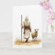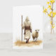 This card shows a hooded figure seen from behind, walking along a light earthen path with an easy, steady stride. The figure wears flowing cream robes tied with a deep brown sash and carries a simple wooden staff, giving the scene a calm, guiding presence. Near their feet, small tufts of golden-brown grass dot the ground, and one bare foot slips into a plain sandal as the other steps forward. Beside them, a small sheep with off-white fleece keeps close, its body angled toward the traveler as if following out of trust and friendship 🐇. The sheep turns its head back toward the viewer with a gentle, inviting look, like a quiet promise to stay near through the walk 🌷. Any lettering sits high on the white space in a soft brown tone, leaving plenty of open area around the figures. The background remains stark white, and soft light picks up the folds in the robe and the textured wool without harsh shadows.