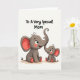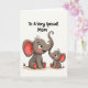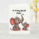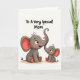 This card shows two simplified elephant characters on a soft ivory background, with a larger adult seated on the left and a smaller youngster nestled close by. Their round bodies and gentle, wide eyes suggest a caring bond, like a quiet moment between close family or best friends ❤️. The adult’s long trunk curves upward and meets the smaller one’s raised trunk at the tip, creating a sweet touch that feels like a nuzzle. Both figures are shaded in muted gray, with coral-pink accents inside their big ears, as small cheek blush, and on the rounded toe pads. Thin black outlines trace their shapes, keeping the look tidy and easy to read while letting the soft colors stand out. Centered above them, the message “To A Very Special Mom” appears in black, hand-lettered text that arches slightly across the top. A tiny 🌼 detail sits near the lettering, and the rest of the space stays open and airy around the pair. The coral-pink inner ears and blush marks are the strongest color spots against the pale background.