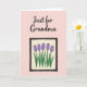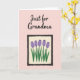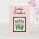 This card features a gentle digital illustration set on a light pink background, with a calm, affectionate mood. Near the top, a short message sits centered in a flowing, dark-colored lettering that stands out clearly against the pale backdrop. The spacing leaves breathing room around the words, like a quiet pause before the picture below. Under the text, a dark-outlined rectangular frame holds a small floral scene that feels like a sweet note shared between close friends ❤️. Inside the frame, five tulip-like blossoms in soft purple rise from a creamy off-white field, their closed petals marked with faint vertical lines. Bright green stems and pointed leaves lean upward with an easy, caring energy, like they’re reaching toward someone’s attention 🌼. The frame’s border is slightly uneven and dark, surrounding the off-white interior and the purple flowers against the pink background.