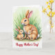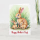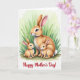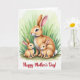 This greeting card shows a tender scene of three human-like rabbits standing close together on a patch of grass, with the taller adult slightly behind the two smaller ones as if guiding them with gentle care ❤️. Their fur is shaded in soft golden brown and creamy white, with light pink inside their long ears and tiny pink noses that add a sweet, affectionate touch. The trio faces forward with dark, calm eyes, and the closeness of their bodies suggests a warm bond like close friendship or family love. Behind them, the setting fades into a spring meadow look, blending light and deep greens into a soft, misty background. Near the bottom of the design, a short Mother’s Day message appears in red lettering, centered beneath the characters. The colors stay soothing and natural, letting the rabbits remain the main focus while the green backdrop adds depth 🌼. The adult rabbit’s ears rise highest, and the two smaller rabbits stand side by side with their ears tilted slightly outward against the layered green field.
