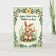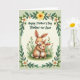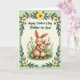 Designed with two long-eared animal characters as the focus, the scene shows a larger brown figure with a creamy belly cuddling a smaller companion close, their faces turned toward each other with soft smiles that feel affectionate ❤️. A light pink blush warms their cheeks, and their rounded features give the embrace a gentle, caring look. They sit in a patch of green grass with fine blades and tiny red dots scattered near their feet, suggesting little blossoms or berries. Around them, slim green stems rise with small buds and a few white, daisy-like flowers, adding a fresh springtime mood 🌼. A looping border of leafy green vines frames the whole picture, dotted with white and yellow flowers for a festive touch. Near the top, a short Mother’s Day message appears in flowing dark green lettering, centered above the pair. A large yellow flower sits at the top center of the border, standing out against the soft green foliage.