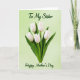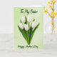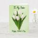 This card features a tall bouquet of five white tulips, their cup-shaped petals softly lit so you can see gentle texture along the edges. The bright white blooms stand close together like a small, affectionate cluster, while deep green stems and pointed leaves rise in a calm, steady rhythm. Behind them sits a pale green background with a subtle gradient that feels airy and calm, letting the flowers feel front and center. At the top, dark green text reads “To My Sister,” placed above the tulips and centered for a close, family-focused touch 👩. Near the bottom, matching dark green text says “Happy Mother’s Day,” also centered, balancing the layout with a quiet, caring feel ❤️. The lettering has smooth, flowing strokes that echo the natural curves of the petals and leaves. The overall palette stays gentle—white, emerald green, and soft green—so the bouquet looks fresh without being loud. Five white tulip heads sit upright against the pale green backdrop, with dark green lines of text at the top and bottom framing the arrangement.