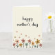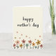 This greeting card centers on the phrase “happy mother’s day” written in flowing, hand-lettered text across the upper two-thirds of the design, set in a medium-dark ink that stands out gently. The background is a creamy off-white with a fine paper-like texture that makes the message feel close and intimate ❤️. Beneath the lettering, a horizontal garden border grows along the bottom edge, like a quiet bouquet offered with care. Simple flowers with broad petals and dark centers sit on slender stems, colored in muted peach, terracotta, mustard, and soft teal for a calm, affectionate look 🌼. A few smaller blossoms drift above the border, spaced loosely as if floating on a light breeze between the words and the flowers. The overall lighting stays soft and even, letting the tender spacing and gentle palette suggest closeness and appreciation without needing extra decoration. Along the base, the stems and leaves form a neat line of stylized blooms with a few scattered mini flowers hovering just above them.