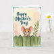 This card shows a soft, painterly illustration centered on a small brown mouse with blush-pink ears peeking over a rustic green picket fence, its wide eyes and gentle smile giving a tender, friendly feel ❤️. The mouse faces forward as if leaning in for a sweet hello, adding a quiet closeness to the scene. Near the top, the words “Happy Mother’s Day” appear in teal, flowing lettering that arches neatly over the character. Behind everything, the background fades through pale pastel washes of creamy yellow, ivory, and a hint of rose, like a calm morning light. On the right side, a delicate leafy branch in muted green reaches inward, balancing the composition and softening the edges. A loose pale-aqua painted border frames the image, keeping the focus on the cozy center. The overall look stays gentle and airy, with the fence’s simple texture grounding the softer colors 🌼. The teal message sits above the mouse while the pale-aqua border runs around the outer edge.