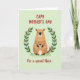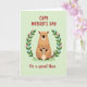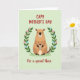 This card shows two cuddly, round-bodied animals hugging close, with the larger one in warm earthy browns holding the smaller one against its chest in a protective, affectionate pose ❤️. Their simple faces—dark, gentle eyes and small curved mouths—create a tender, friendly look between them that feels like a quiet moment of closeness. A leafy green wreath surrounds the pair, dotted with small pink and soft blue flowers that add a sweet, garden-like setting 🌼. The background is a pale, calming green that keeps the focus on the embrace without busy details. Near the top, a short message appears in deep red lettering, and a second line of the same red text sits lower on the card, balanced around the illustration. The overall style uses flat shapes and minimal shading, giving everything a smooth, easy-to-read look. A tiny pale blue flower rests at the smaller animal’s throat, like a little gift tucked into the cuddle. The wreath’s leaves curve in an oval around them, with blossoms spaced evenly along the greenery.