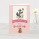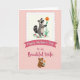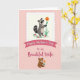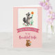 This greeting card features a soft pastel pink background with a scalloped rectangular frame near the top. Inside the frame, a friendly gray woodland animal with a dark face mask and a ringed tail stands holding up an orange daisy on a bright green stem, gazing upward as if sharing a sweet moment ❤️. Beneath the framed scene, a ribbon-shaped banner stretches across the card with a short greeting set in white letters. Just below that, a smaller line of text appears in a thin, flowing style, also in white, like a quiet note meant for someone special. Near the bottom, a small smiling brown bear sits holding its own orange flower, echoing the larger animal’s gesture like a shy offering between friends 🌼. Gentle shading and smooth outlines add depth while keeping the look soft and cozy. The orange petals and green stems stand out against the pink field, and the scalloped frame edges are lightly outlined to separate the top illustration from the text area.