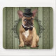 Gorgeous fawn french bulldog with top hat, bow tie, and green vintage stripes in the background, painted by artist Maryline Cazenave.