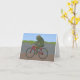 A dark green frog wearing a tan plaid ivy cap (or driving cap) and a satisfied smile pedals along on a red bicycle on a dirt road by a moss-covered gray stone wall in the mixed media image on this note card. With deep blue skies above, it looks like he has a beautiful day for cycling! From my original digitally created image.