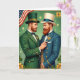 This card shows two well-dressed gentlemen facing each other in a festive green setting, sharing a close, affectionate moment 💚. The man on the left wears an emerald suit and matching top hat with a thin gold band, his eyes fixed on his companion with a tender, steady look. He reaches up to adjust a detailed gold boutonnière on the other man’s lapel, a small gesture that reads like quiet care between friends or partners. Opposite him, the second gentleman stands in a teal suit with a crisp white top hat trimmed in blue, his neatly groomed beard and relaxed posture suggesting comfort and trust. Behind them, the background is deep green and dotted with small clovers, with larger gold shamrocks placed near the lower corners ☘️. A small American flag drapes from the upper left, adding a subtle accent above the sea of greens and golds. The St. Patrick’s Day greeting text sits near the top in gold lettering, standing out against the green backdrop. Golden shamrocks frame the bottom edge while scattered clovers fill the space around the pair.