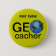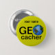 This geocaching design custom name button says GEOcacher. The O is an image of an earth with flags on it, like flags where you're looking for caches.