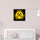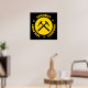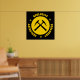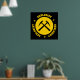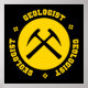 Black and yellow poster with crossed rock hammers emblem surrounded by "GEOLOGIST" in repeating collegiate style lettering.