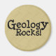 "Geology Rocks!" on a magnet with a brown rock hammer background. It's the standard geology saying.