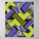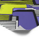 This abstract design is composed of interlocking geometric shapes in bold shades of purple and green, contrasted with black and white lines. The repetition and symmetry create a dynamic pattern that resembles modern murals or futuristic digital designs. The sharp edges and vivid contrasts give the artwork a sense of movement, rhythm, and structured harmony.