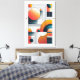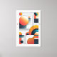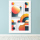 The image presents a striking piece of abstract art that features a variety of geometric shapes and lines. Dominating the composition is a large, central orange circle, surrounded by an array of black, white, and colored elements. These include smaller circles in hues of red, blue, green, and yellow; straight and curved black lines; rectangles; and half-circles. The background is primarily white with sections of light gray vertical stripes. The artwork has a modernist feel with its clean lines and bold use of color contrasted against the neutral background.