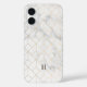 Elegant monogrammed phone case features a printed marble patterned background in pale shades of gray and white, with an art deco style geometric patterned overlay in faux gold foil. Add your single initial monogram in classic black lettering to make this chic case your own.