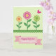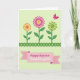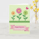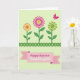 Designed with a springtime look, this card centers on three stylized flowers that feel like they’re leaning toward each other in friendly closeness 🌷. Each bloom is built from geometric shapes and repeating patterns, giving the petals a tidy, decorative rhythm. The flowers rise on green stems from a dark green ornamental border along the bottom that resembles a trimmed garden edge. Behind them, a pale green background keeps the scene calm and lets the brighter colors stand out. The left flower mixes orange and yellow, the middle pairs fuchsia with yellow, and the right combines lime green with yellow, creating a lively trio that still feels balanced. In the upper right, a fuchsia butterfly adds a light, fluttering accent 🐇. Along the bottom, a pink ribbon-shaped banner with small white dotted details holds the greeting text in a centered layout, standing out clearly against the darker border. The banner sits just above the deep green base, with the dotted lines tracing the ribbon’s curves and the butterfly angled as if drifting inward from the corner.