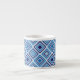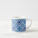 Geometric espresso mug with a tile pattern of diamond shapes in shades of blue.