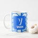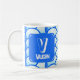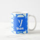 This monogram mug is a great way to add a unique accent to your morning routine. A bright blue geometric pattern appears against a lighter blue background. The letter "V" is featured in a square along with the family name. The letter and your name can quickly and easily be personalized.