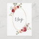 Wedding RSVP card features a geometric oval centerpiece with burgundy flowers and eucalyptus.