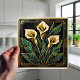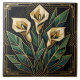 Embrace the elegance of the Art Deco era with this stunning ceramic tile, featuring a stylized geometric depiction of calla lilies. The design showcases the graceful lines of the flowers in creamy gold hues, contrasted by lush, emerald green leaves, all outlined with luxurious gold accents. This piece draws inspiration from the iconic Art Deco movement, characterized by its bold geometric shapes and sophisticated color palette, bringing a touch of vintage glamour and artistic flair to any space. It's perfect for adding a statement piece to your kitchen backsplash, bathroom walls, or as a decorative accent anywhere in your home.