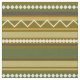 Geometric pattern features green gold and ivory in horizontal stripes and chevron lines. Some circle and diamond shapes.