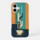 A stylized coffee cup with geometric steam in a colorful and soothing retro setting.