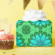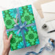 Wrapping paper in a geometric daisy pattern in turquoise and dark and light emerald green