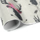 Wrapping paper with a black deer head with large antlers and made with geometric lines and wearing a pink floral crown. Crossed arrows below. Rustic and trendy design.The background is a digital image of soft beige colored wooden planks.