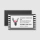 A wedding save the date magnetic business card. Designed with a black deer head made with geometric lines and wearing a pink floral crown. Background is a pattern with black and white stripes.