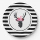 Paper plates with a black deer head made with geometric lines and wearing a pink floral crown. Rustic and trendy design. Background is a pattern with black and white stripes.