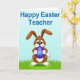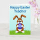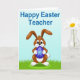 At the center of the card is a sweet, upright bunny 🐰 in warm chocolate-brown, with creamy white on its belly, paws, and a small fluffy tail. Its big black eyes and slight smile give it a friendly, affectionate look, as if it’s sharing a quiet joke with someone close by. The bunny hugs an oversized decorated egg, holding it tight in a way that suggests closeness and care. The egg is covered in geometric patterns—radiating lines and ring shapes—in deep and electric blues that catch the eye with a glossy, glowing feel. Along the bottom third, a bright strip of stylized green grass stretches across the scene like a soft spring carpet 🌷. Above that, a gentle light-blue sky fades upward, keeping the background airy and calm. Near the top, a seasonal greeting appears in deep blue text, centered across the upper area. The patterned egg shows concentric circles and sharp blue rays against the smooth sky gradient.