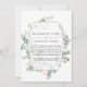 Eucalyptus rustic wild greenery themed wedding reduced guest list announcement card with a gold geometric frame. In these uncertain times, it can happen that you may have to hold a smaller wedding than originally planned. This announcement card will take away the awkwardness and take a load off your mind! You can furthermore provide an option to join you for a virtual ceremony.