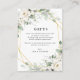 Geometric wedding theme with white watercolor flowers and a faux gold frame. You can also include gift registry information on this card.