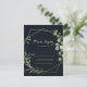 These geometric gold blue green calligraphy RSVP cards are perfect for a modern wedding. The design features hand-painted beautiful green leaves in a dark blue background, adorning a gold geometric frame.