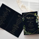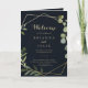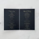 This geometric gold blue green folded wedding program is perfect for a simple wedding. The design features hand-painted beautiful green leaves in a dark blue background, adorning a gold geometric frame.