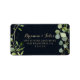 This geometric gold blue green wedding RSVP address label is perfect for a modern wedding. The design features hand-painted beautiful green leaves in a dark blue background, adorning a gold geometric frame.
