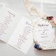 This geometric gold glitter calligraphy folded wedding program is perfect for a modern wedding. The design features hand-drawn watercolor purple, navy, blush, burgundy, navy flowers, green and gold leaves adorning an elegant geometric frame.
