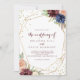 This geometric gold glitter calligraphy wedding invitation is perfect for a rustic wedding. The design features hand-drawn watercolor purple, navy, blush, burgundy, navy flowers, green and gold leaves adorning an elegant geometric frame.