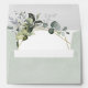 Design (inside) features eucalyptus, succulents and greenery elements in shades of dusty sage and blue/gray with a printed gold colored geometric terrarium border wreath frame. The exterior features a dusty sage green natural matching watercolor background.